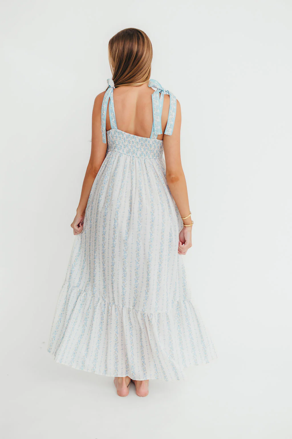 Cora Smocked Bow Tie Strap Maxi Dress in Blue