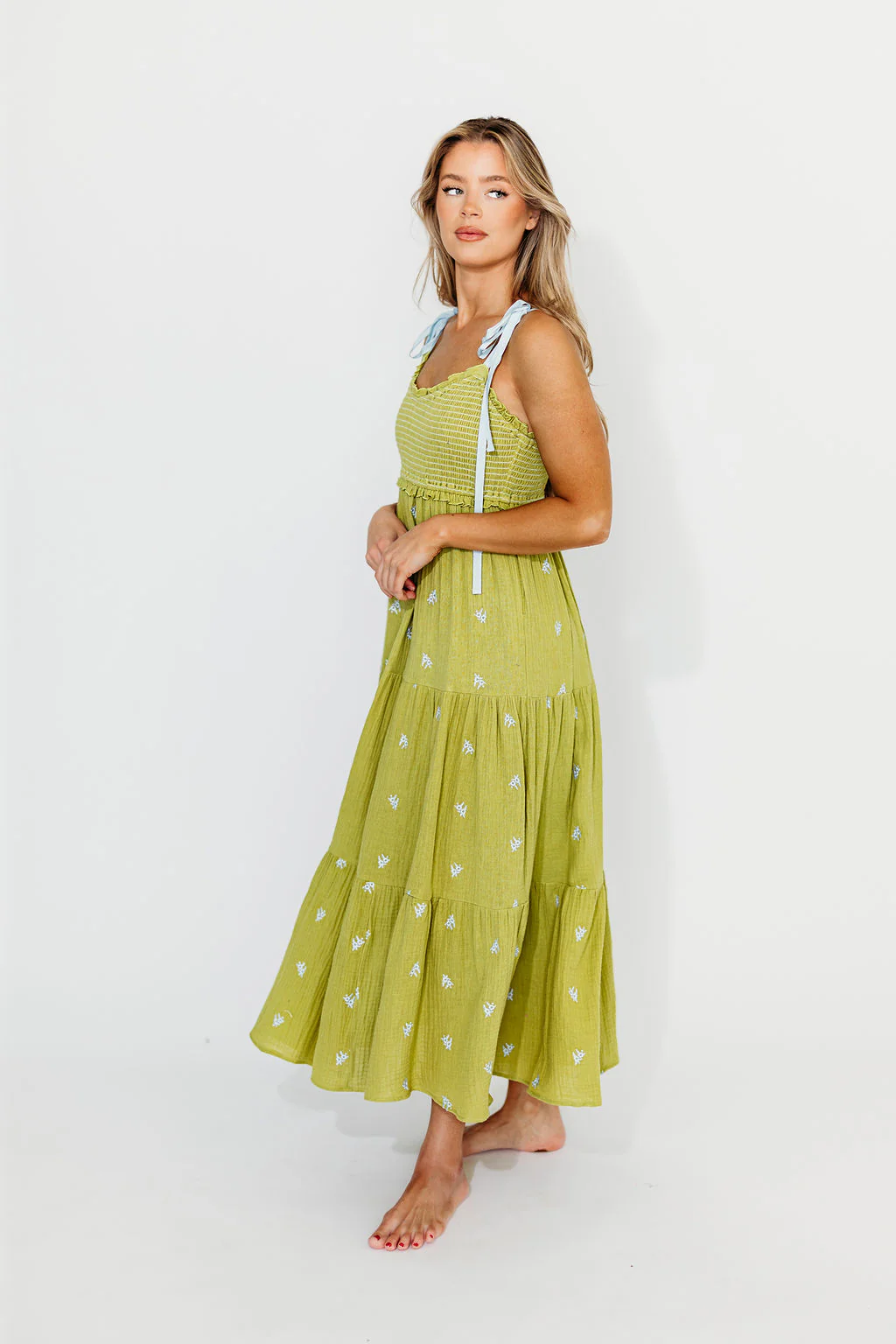 Kiana 100% Cotton Smocked Embroidered Gauze Maxi in Moss