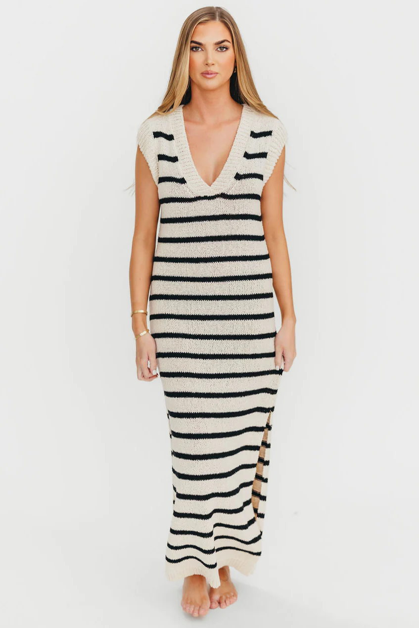 Carley Cotton & Linen Maxi Dress in Beige/Charcoal Stripe