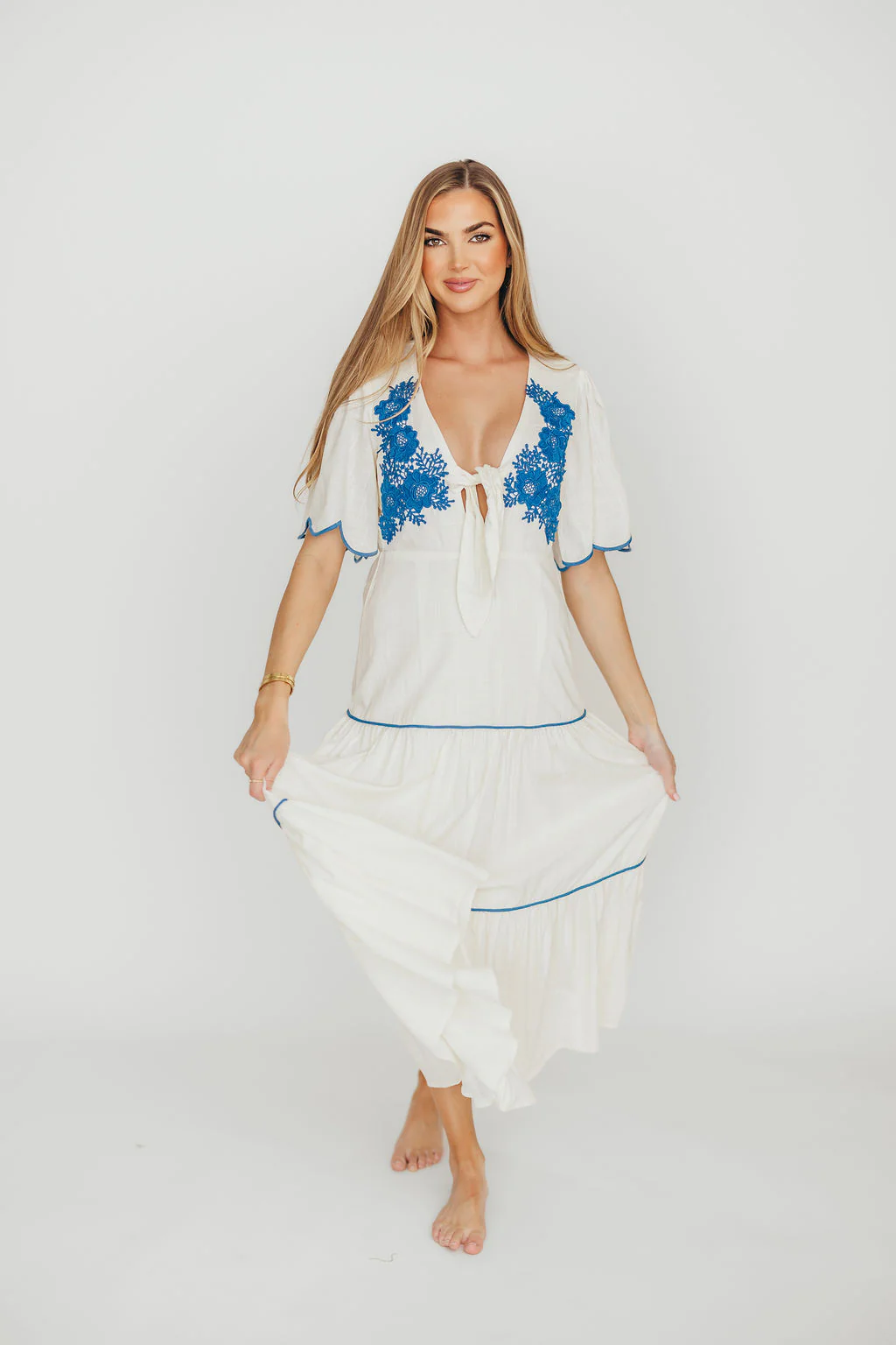 Lena Embroidered Tiered Midi Dress in Off-White/Blue