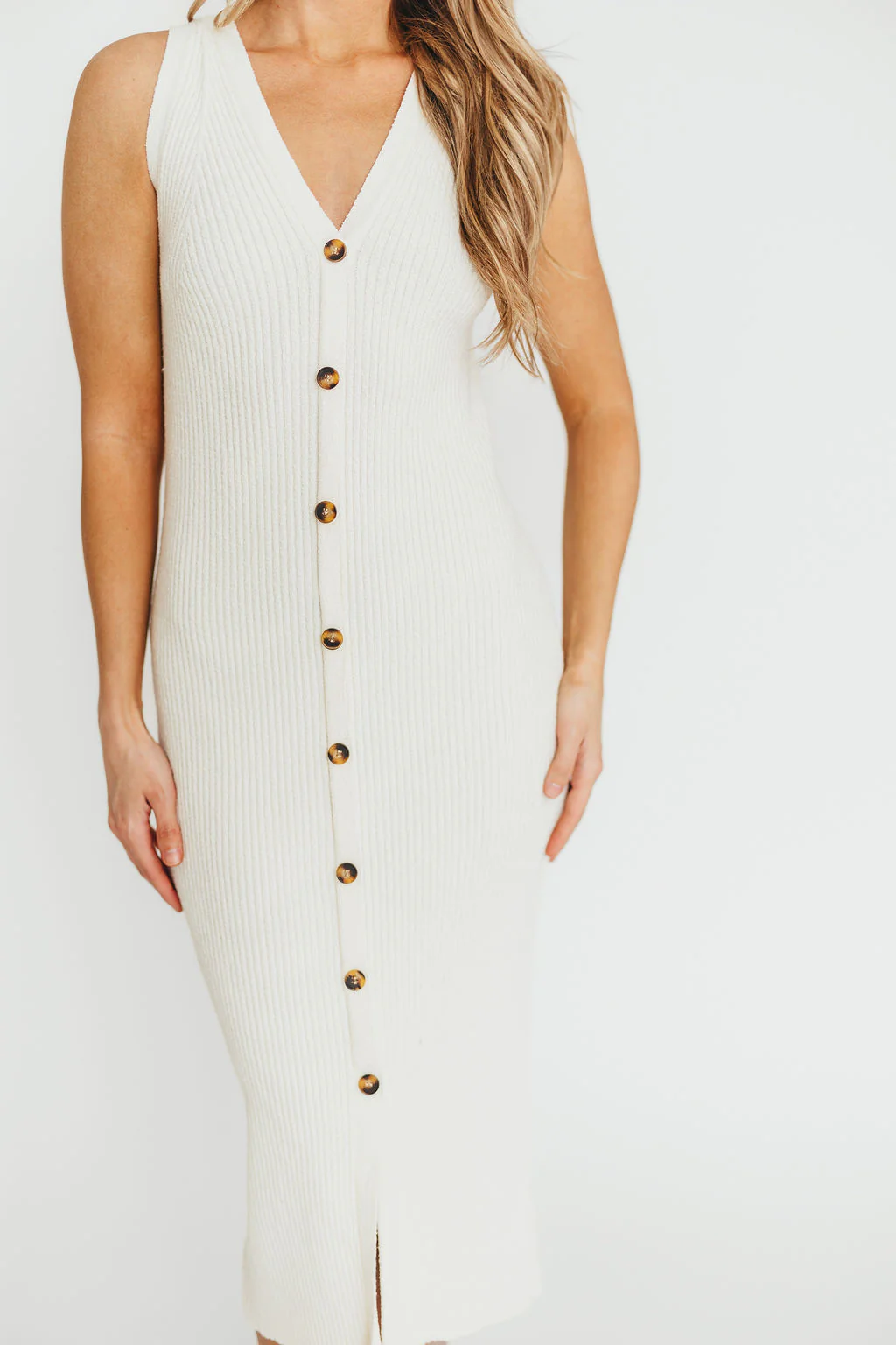 Lelani Button Down Ribbed Knit Midi Dress in White - Nursing Friendly