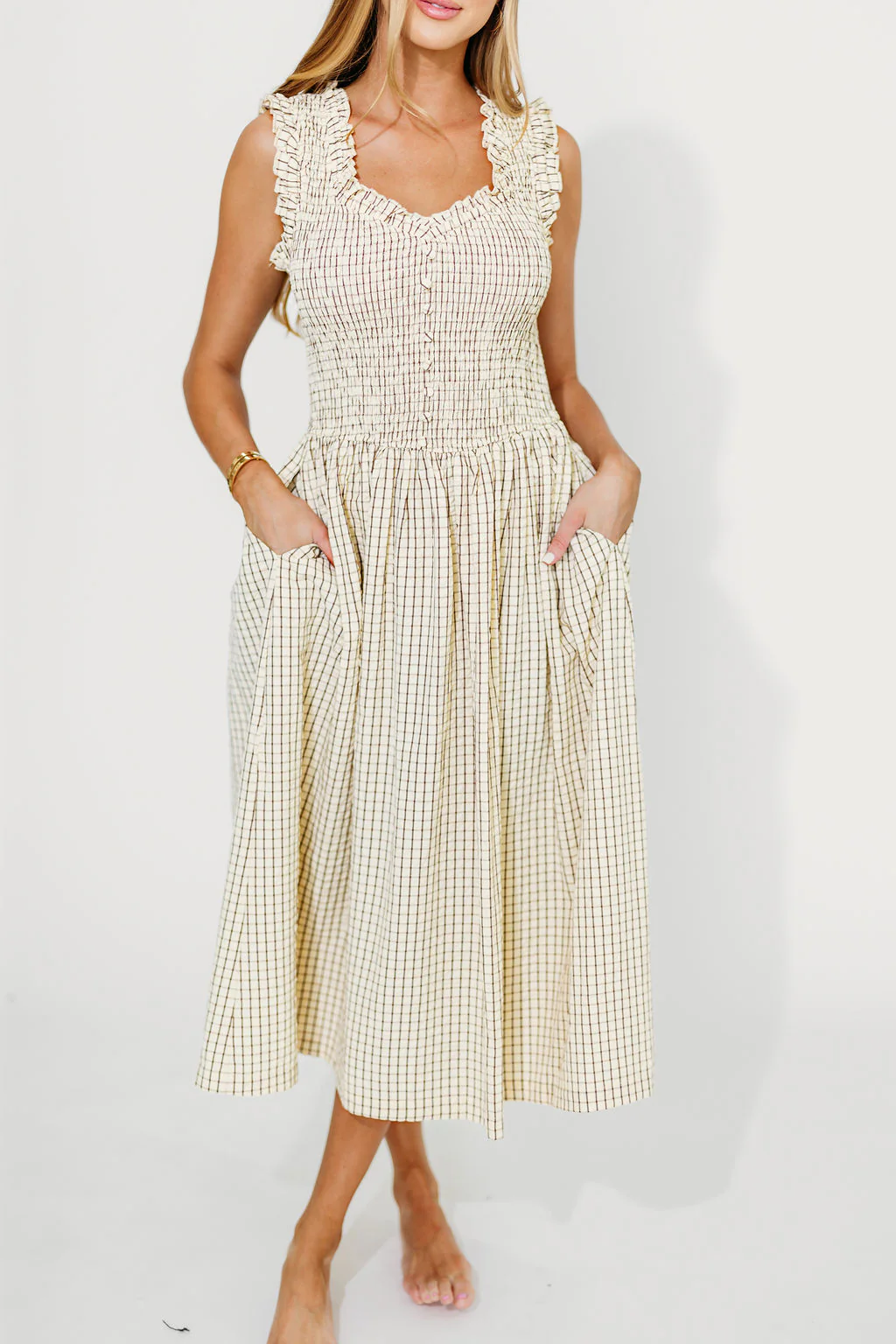 Kimber Midi Dress with Drawstring Detail in Yellow Floral