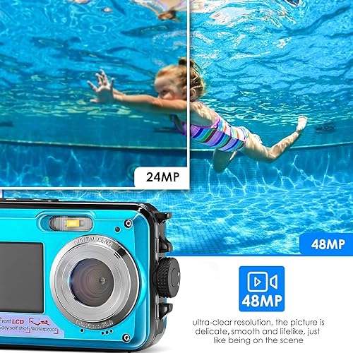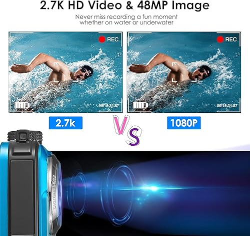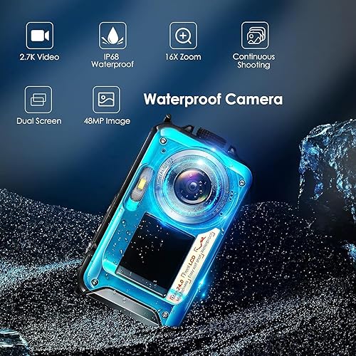 Biebuxo Macchina Fotografica Subcquea Full HD 2,7 K 48 MP Fotocamera impermeabile digitale 16 x Fotocamera Subacquea con microfono a LED ritardatore per adolescenti, student