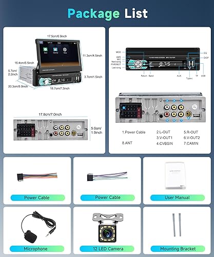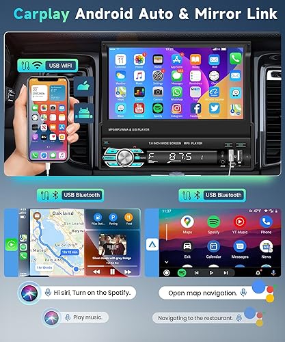 Podofo 7'Autoradio Bluetooth Con Schermo Manuale a Scomparsa Carplay Wireless Android Auto,FM Radio con 2 USB/Type-C/AUX/SD/Controllo Al Volante+12LED Retrocamera/7 Luci Colorate