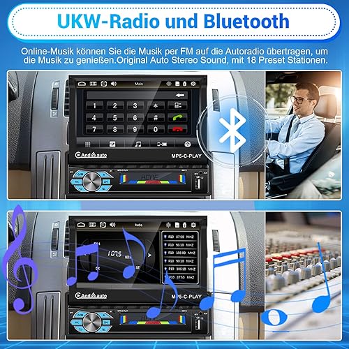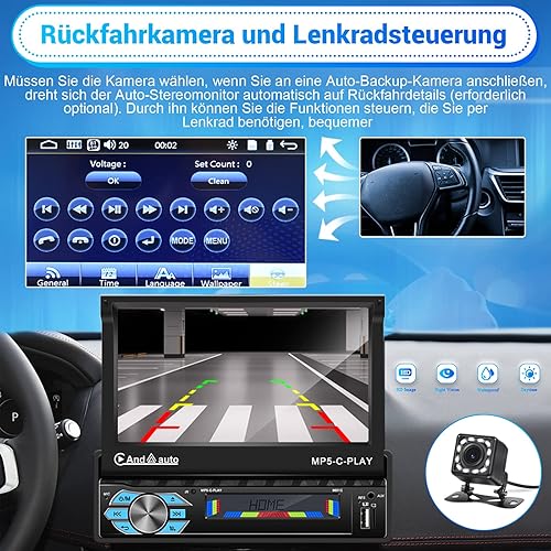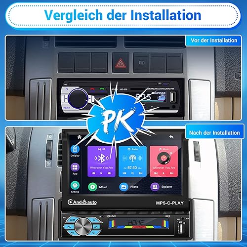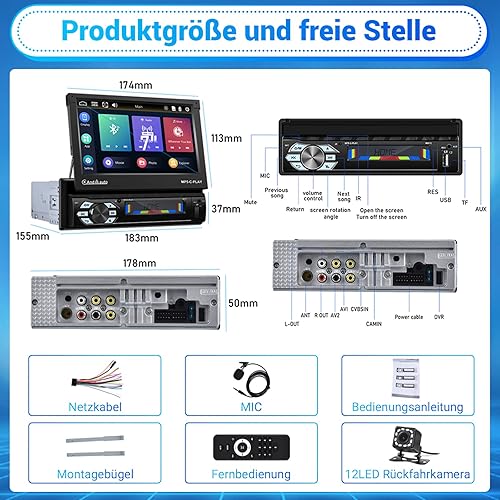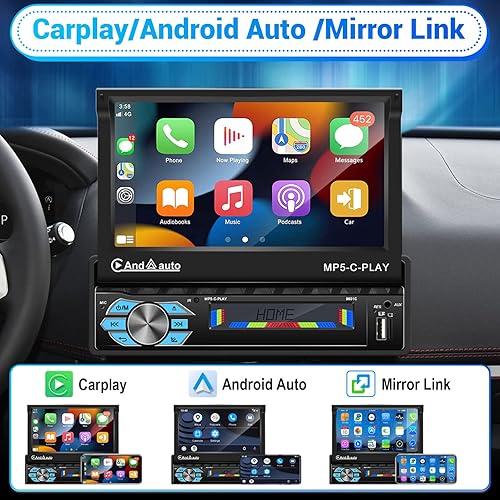 Hikity Carplay Autoradio 1 Din con Schermo a Scomparsa Automatico, 7 Pollici Touch Screen MP5 Player Autoradio a scomparsa con Bluetooth Vivavoce Android Auto USB FM AUX TF Telecamera Posteriore