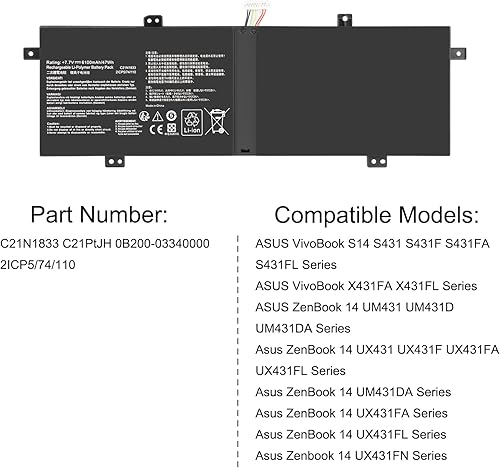 C21N1833 - Batteria per Asus ZenBook 14 UM431 UM431D UM431DA UX431 UX431F UX431FA UX431FL UX431FN UX431DA X431FA X431FL S431FA-EB159T VivoBook S14 1 S433 1F S431FA S431FL