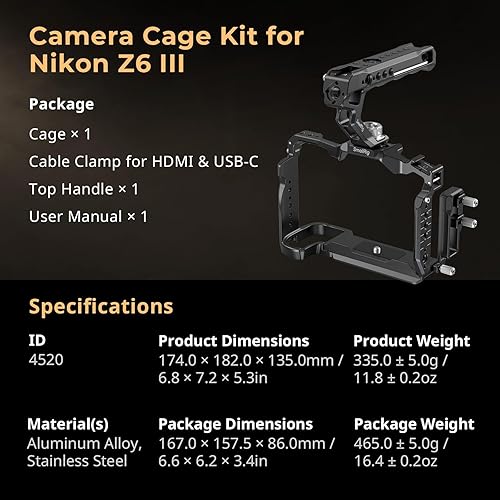 SMALLRIG Z6III Cage Kit per Nikon Z6III, con Maniglia Superiore e Morsetto per Cavi, Kit Gabbia in Lega di Alluminio con Design Anti-torsione, Piastra a Sgancio Rapido Integrata per Arca - 4520