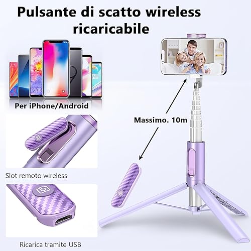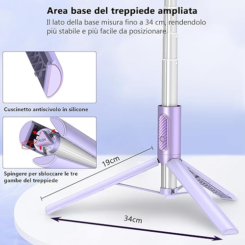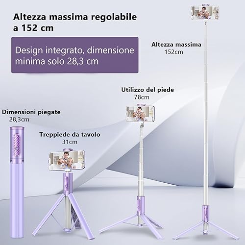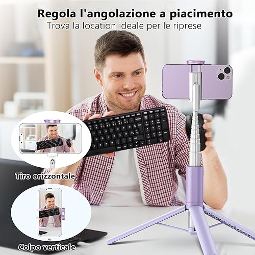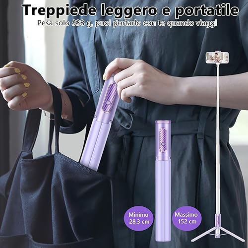 TONEOF 152CM Bastone Selfie Treppiede, Tutto in 1 Treppiede Smartphone Estensibile in Alluminio con Telecomando Wireless Selfie Stick Treppiede portatile e leggero per iPhone e Android Telefono-Viola