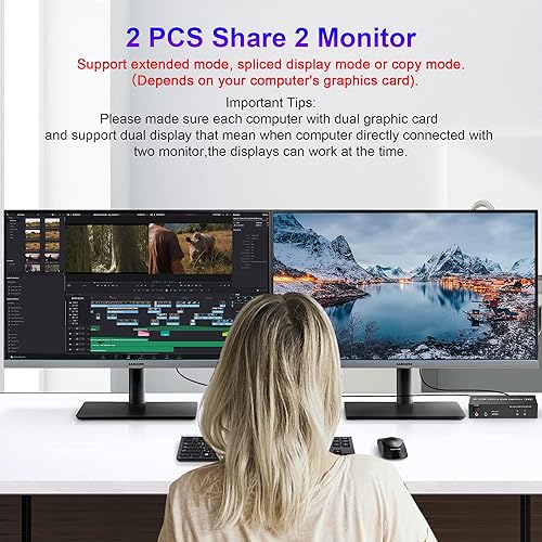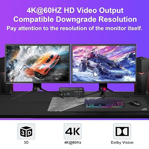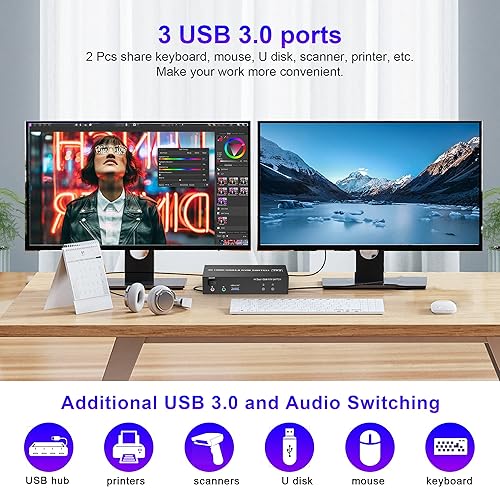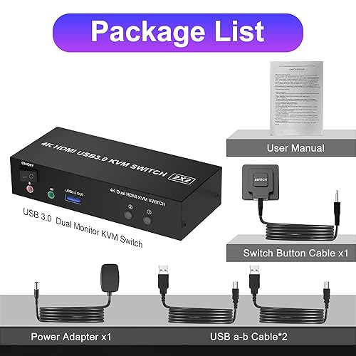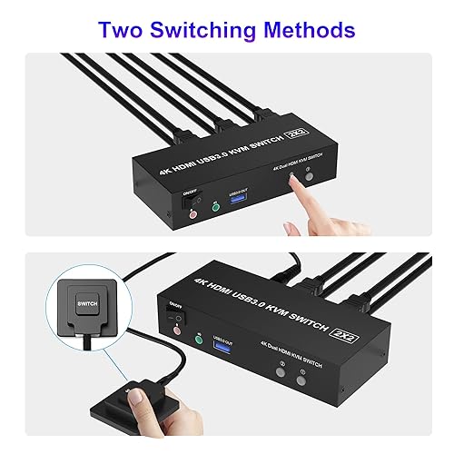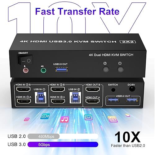 Switch KVM per doppio monitor USB 3.0 HDMI 2 porte, 4K a 60 Hz Switch KVM per display esteso 2 monitor 2 computer con uscita microfono audio e 3 porte USB 3.0, switcher mouse tastiera monitor PC