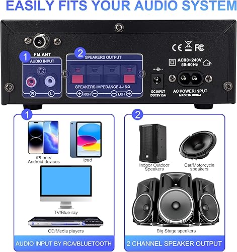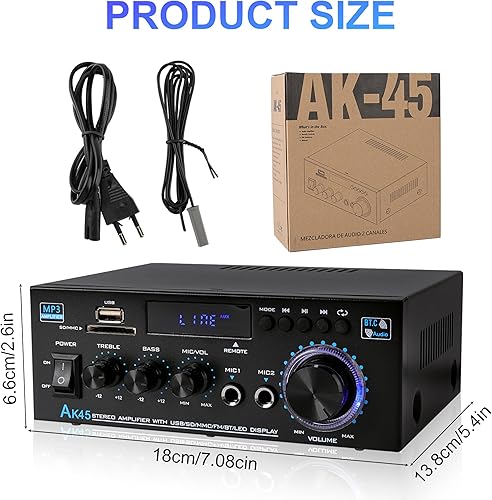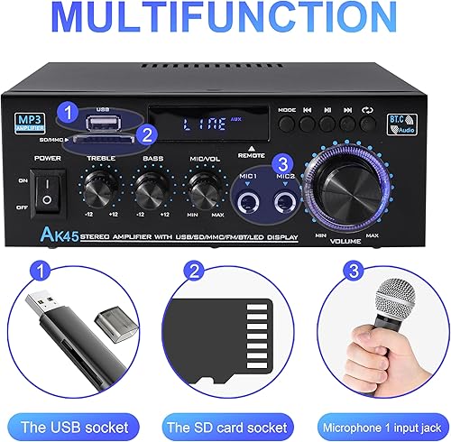 Amplificatore Bluetooth 800W, RMS 40W×2 Amplificatore HiFi, Ricevitore Amplificatore Stereo Amp per Home Theater, Altoparlante Auto W/Mic USB FM Radio Stereo