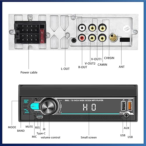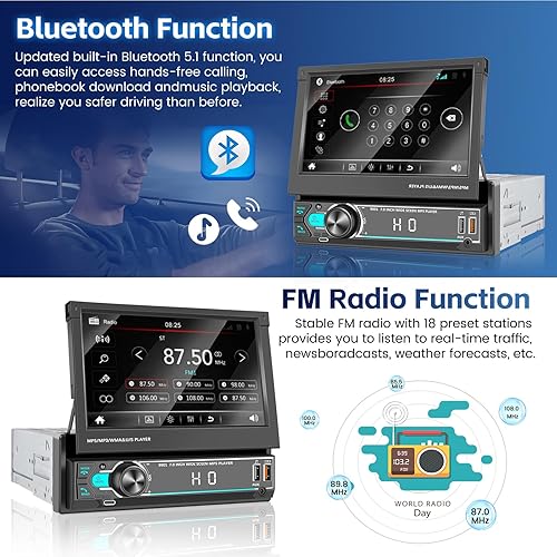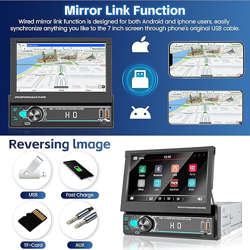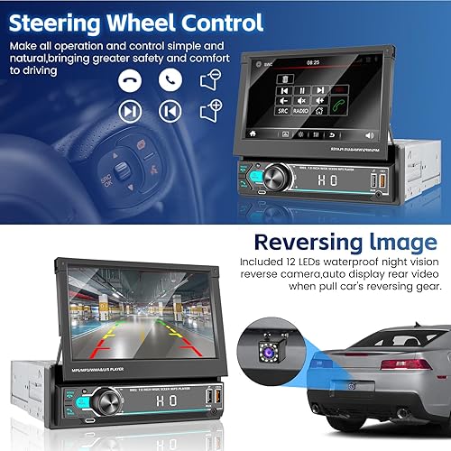 Inefala Autoradio 1 DIN con Schermo a Scomparsa, 7 Pollici Touchscreen Stereo Auto Bluetooth con Mirror Link Radio FM EQ 2USB+Type-C AUX SWC +Retrocamera+Telecomando