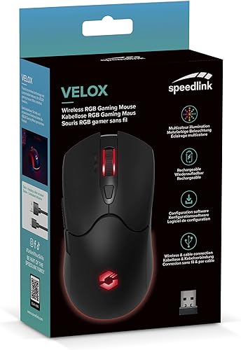 Speedlink VELOX Mouse Gaming Wireless RGB - Mouse per PC senza Fili con Batteria ricaricabile, USB-C, 4800 dpi, programmabile, leggero, ricevitore USB nano, illuminazione LED RGB, nero