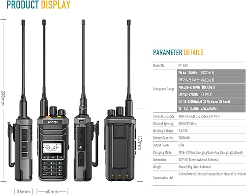 Radtel RT-860 Radio Multibanda Ham HF UHF VHF Dual Band con Ricezione AM USB LSB CW CB LW MW SW SSB, 1024 Canali, Batteria da 2000mAh, Ricarica Type-C e Antenna a Onde Corte Migliorata opzionale.