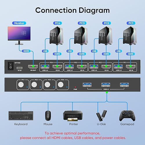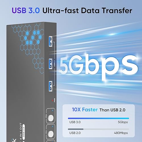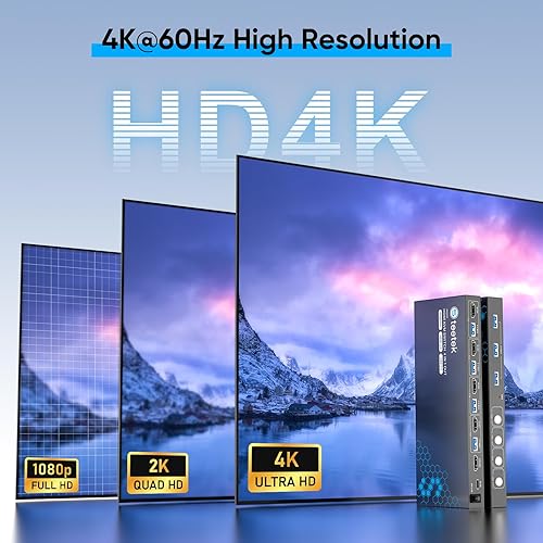 Switch KVM 4 PC 1 Monitor, Switch KVM HDMI 4K@60Hz con 3 porte USB 3.0 per 4 computer che condividono 1 monitor/tastiera/mouse, HDCP 2.2, Plug and Play, con 1 cavo HDMI e 3 cavi USB