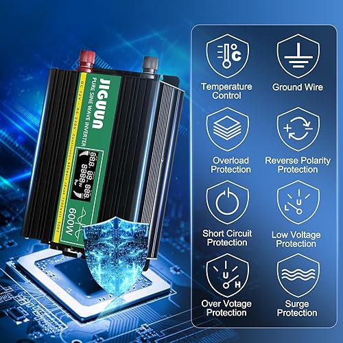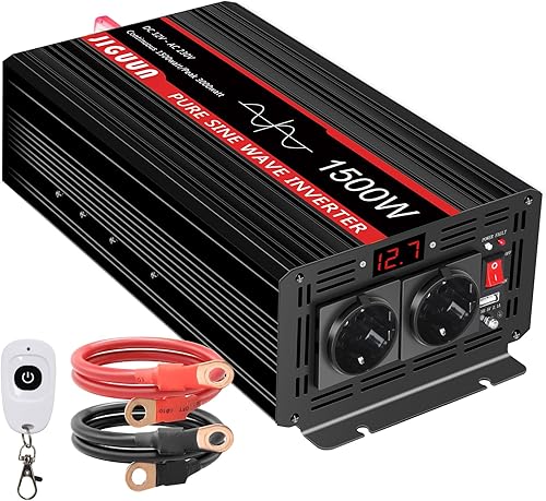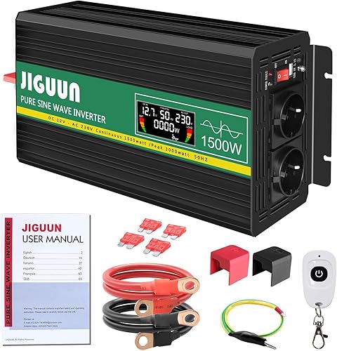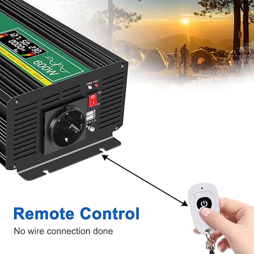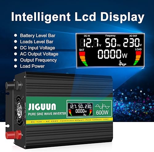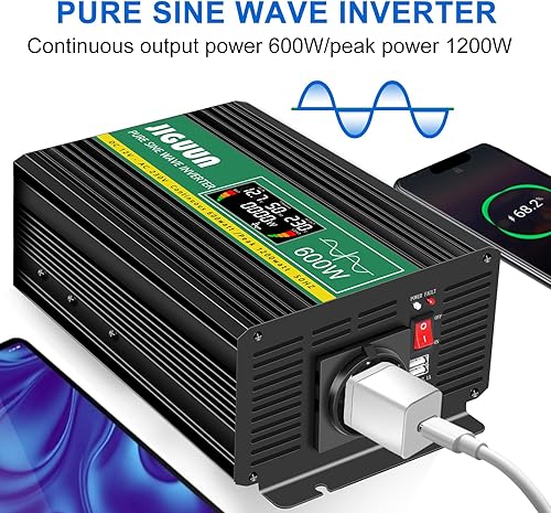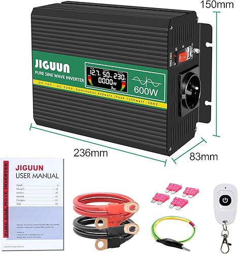 JIGUUN 600W inverter 12v 220v onda pura Convertitore con presa UE e 2 uscite USB 2,1A,telecomando wireless e display LCD Potenza di picco 1200W
