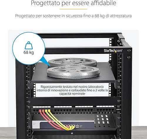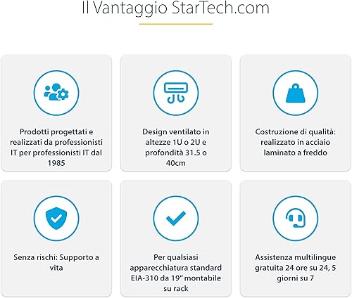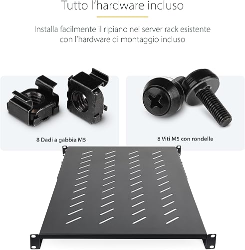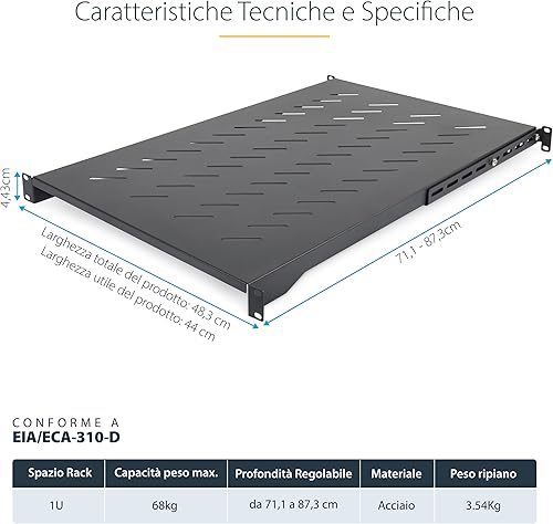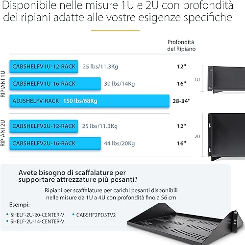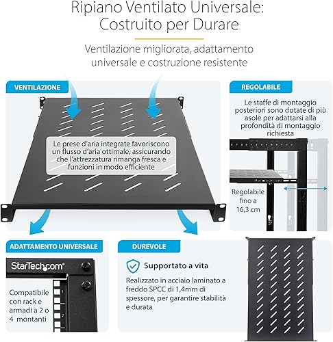StarTech.com Ripiano Rack 19' 1U Ventilato, Mensola Regolabile (71,1-87,3cm) in Acciaio per Armadio Rack a 4 Montanti. Max 68kg