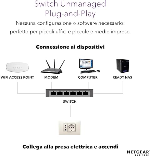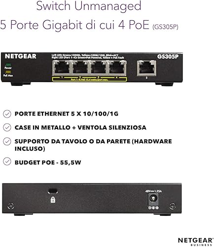 NETGEAR GS305P Switch Ethernet Poe 5 Porte Gigabit, 4 Porte Poe e Budget energetico Pari a 55W, Switch unmanaged Desktop, Struttura in Metallo Senza ventole