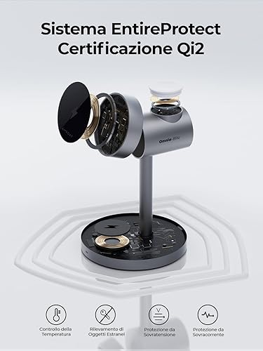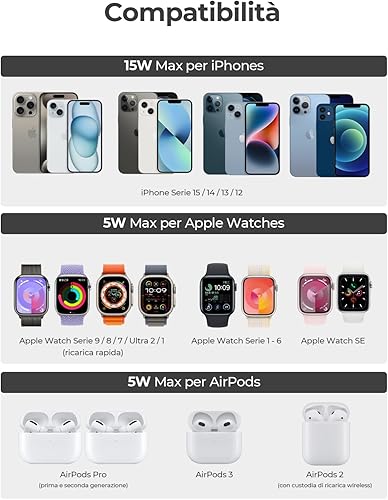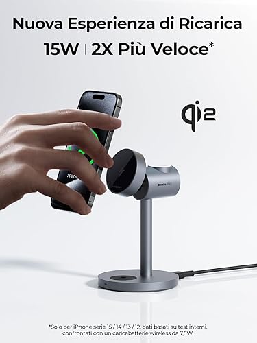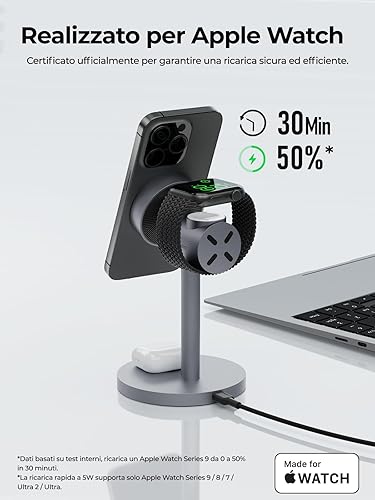 AMEGAT Caricatore Wireless Magnetico 3 in 1, 15W Certificato Qi2 Stazione di Ricarica, Caricabatterie Wireless per Telefoni, Orologi, Auricolari (Caricatore USB C 30W Incluso)