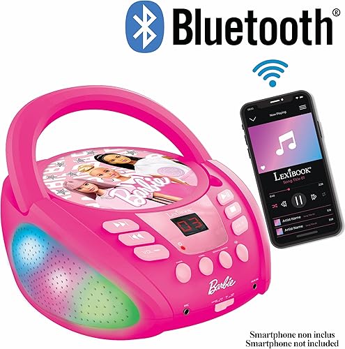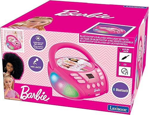 Lexibook - Barbie - Lettore CD Bluetooth per bambini - Portatile, Effetti luminosi multicolore, Presa microfono, Presa Aux-in, Alimentazione a corrente alternata o a batteria, Rosa, RCD109BB