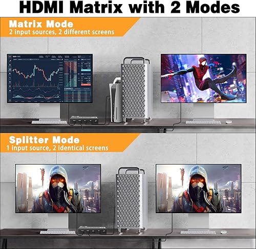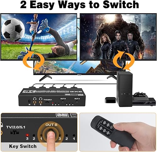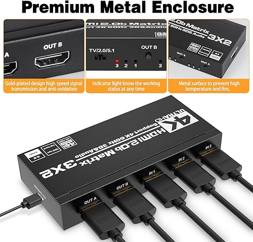 Matrix HDMI 3x2 - Tendak 3 in 2 Out Commutatore HDMI Matrix 4K@60Hz HDMI Splitter SPDIF + 3,5mm Stereo Estrattore Audio Supporta HDMI 2.0 HDCP 2.2 HDR 3D con Telecomando IR