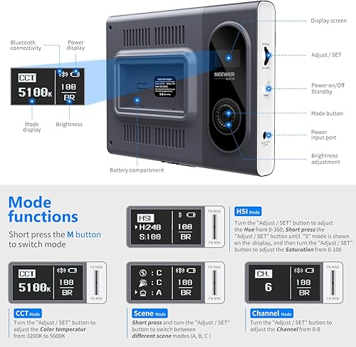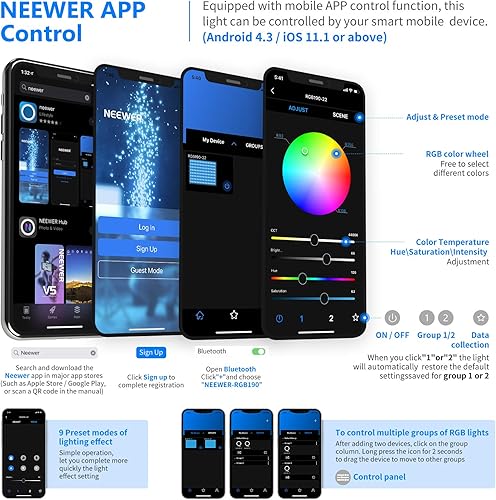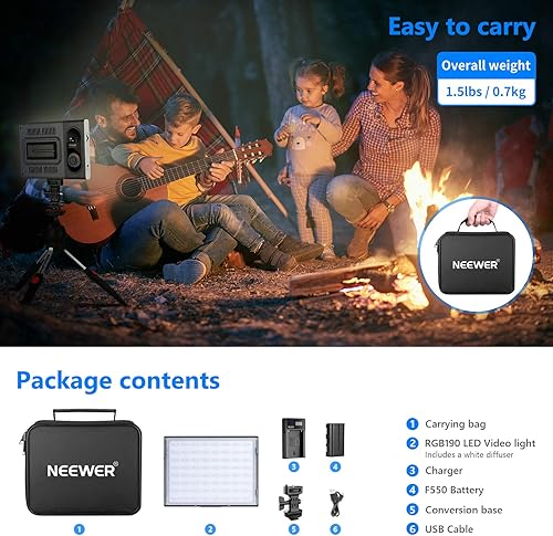 Neewer RGB190 - Luce video a LED con kit di batteria, controllo APP, schermo LCD, regolazione precisa della saturazione della tonalità a colori, CRI97 + 3200K-5600K 9 effetti RGB, pannello LED per