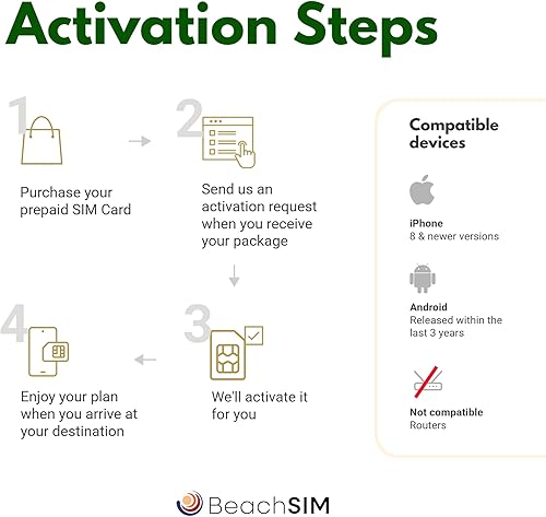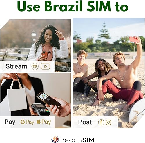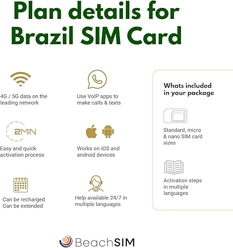 BeachSIM Carta SIM Brasile 30 giorni. 12 GB di Dati Solo a Velocità 4G/5G. Attivazione Rapida. Facile da Ricaricare. Funziona Su dispositivi iOS e Android