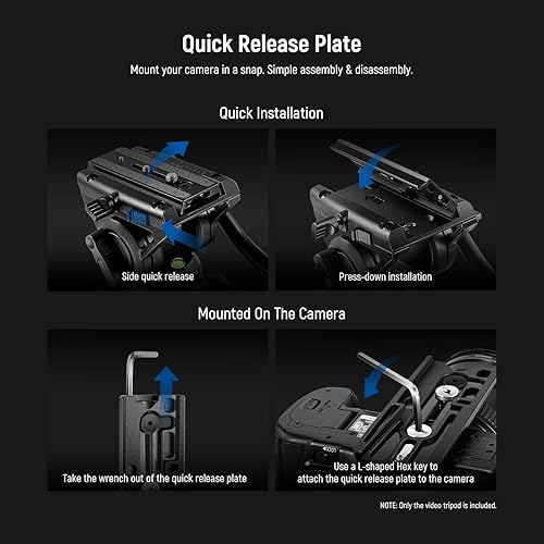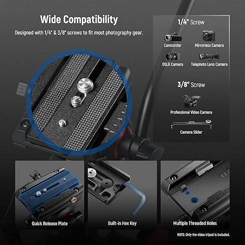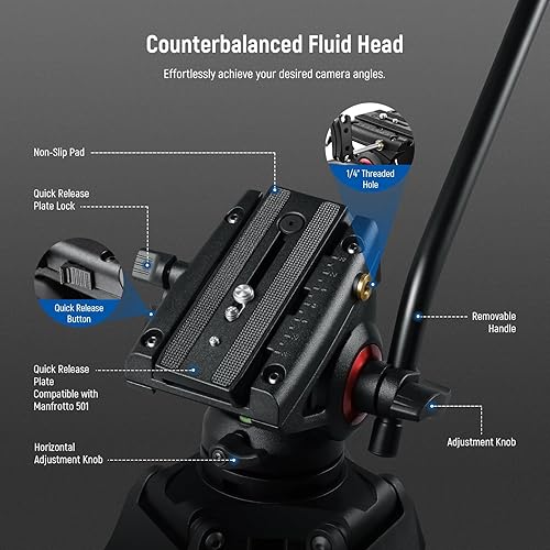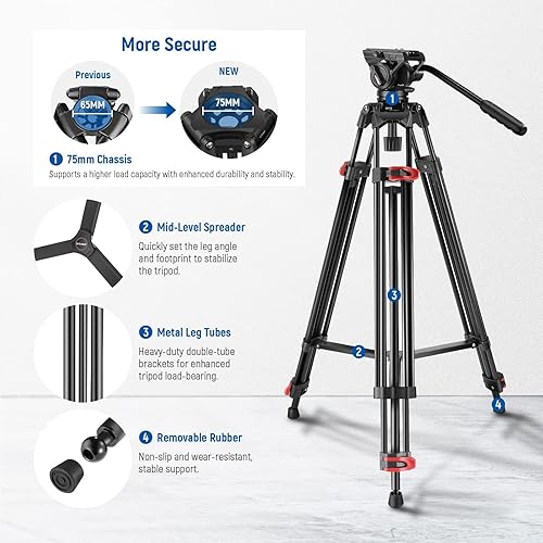 NEEWER Treppiede Video Pro 74' con Testa Fluida, Treppiede Alluminio Resistente con Testa Pan 360°e Incli -70°/+90° Piastra Sgancio Rapido e Divaricatore di Livello Medio per Fotocamera, Max 8kg, GM88