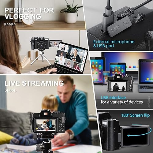 Monitech Videocamera digitale Monitech per fotografia e video, videocamera per vlogging 4K 48MP per YouTube con schermo ribaltabile a 180°, zoom digitale 16X, scheda TF da 32 GB, 2 batterie