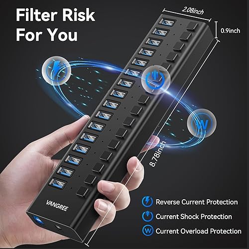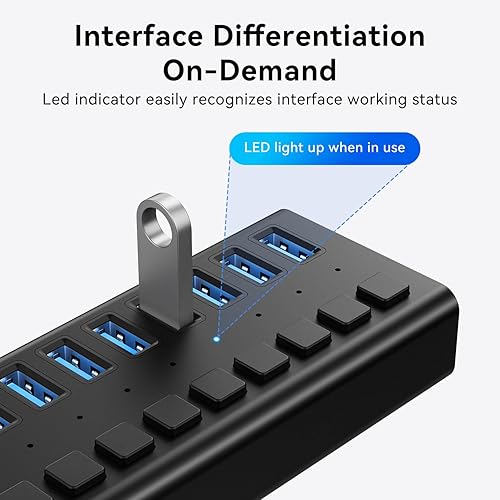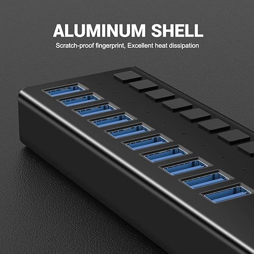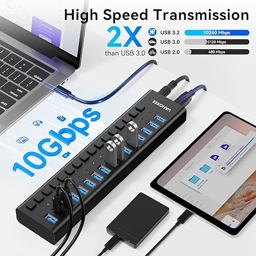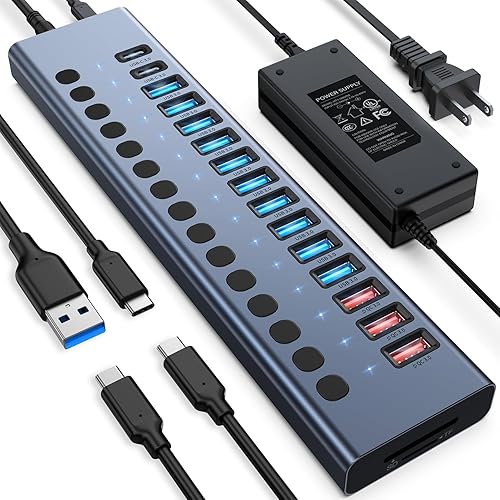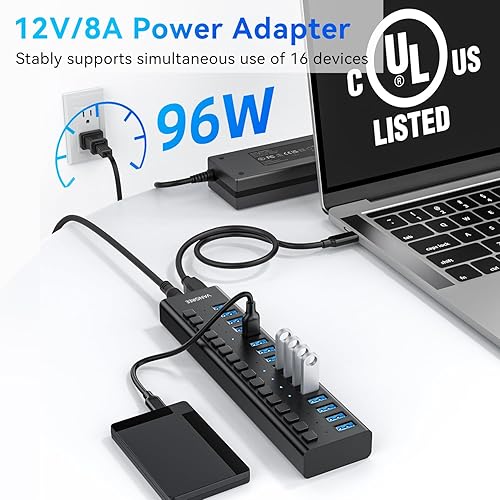 Hub USB alimentato da 10 Gbps, hub USB 3.2 a 16 porte da 96 W, interruttori di accensione/spegnimento individuali, adattatore di alimentazione 12 V/8 A, splitter USB 3.2 per laptop, PC, computer.