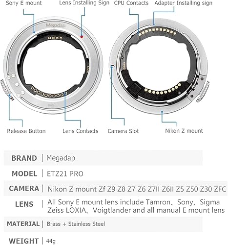 Megadap ETZ21 PRO - Adattatore per obiettivo AF integrato con apertura elettronica compatibile con fotocamera Nikon Z Zf Z5II Z9 Z8 Z7II Z7 Z6III Z6II Z5 Z50II Z30 ZFC per Sony FE