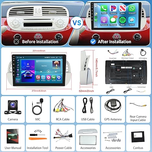 2G+64G Wireless Carplay Android Autoradio 2 Din per FIAT 500 2007-2015 9 Pollici Autoradio con Android Auto GPS Navi WiFi Mirror Link Bluetooth FM/RDS/DAB Telecamera Posteriore