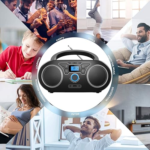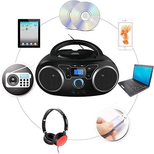 WISCENT Lettore CD Boombox Portatile - Stereo con Radio FM, Ingresso Bluetooth, USB, AUX, Uscita Auricolari, Audio Domestico Compatto, AC o Alimentato a Batteria