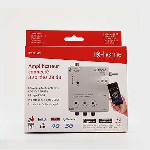 Amplificatore TV TNT Interno 3 Uscite 28dB Collegato Filtrato 4G-5G - Funziona con App Mobile TV Finder per Trovare il Miglior Segnale Disponibile. Per qualsiasi antenna