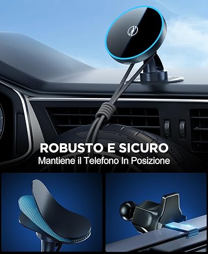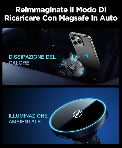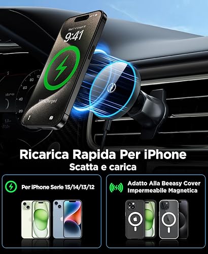 Beeasy 15W Magnetico Caricatore Auto Wireless, 2 In 1 MagSafe Auto Ricarica Wireless, Vent/Cruscotto Porta Cellulare Auto Magnetico per iPhone 16 15 14 13 12 Pro Max Plus Mini