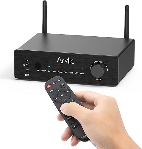 Arylic Amplificatore B50 con Bluetooth, amplificatore stereo, 2 canali 50 W*2 Home Audio AMP, con HDMI, ARC, Opt, DAC, ingresso Phono. Supporta la trasmissione e la ricezione di musica ad alta