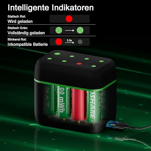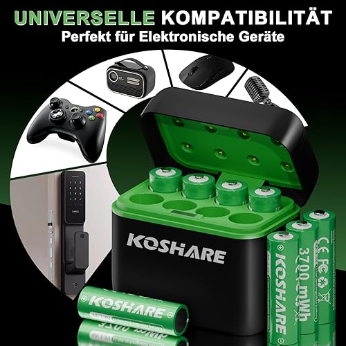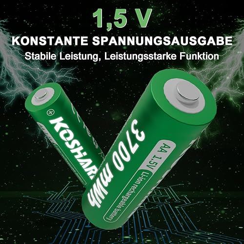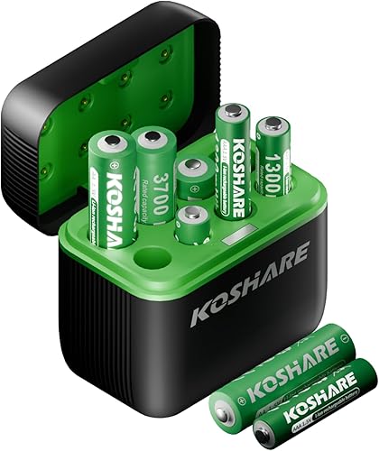 Batterie ricaricabili AA al litio, confezione da 8 con caricabatterie, 1,5 V, 3700 mWh, alta capacità, celle agli ioni di litio doppie A, ricaricabili fino a 1200 volte (nero+verde, 8AA+8 slot