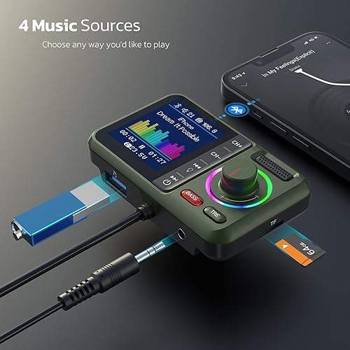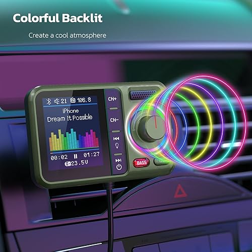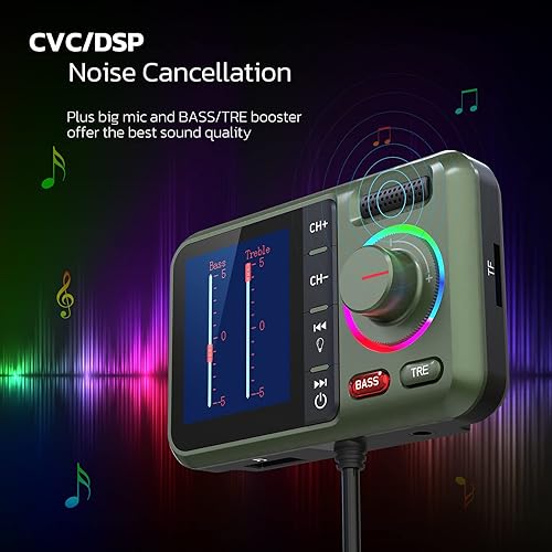 Trasmettitore FM Bluetooth per Auto, BT5.0 con Grande Schermo a Colori, Supporto Chiamate in Vivavoce, Siri&Google, Lettore Musicale MP3 BASS&TRE Booster, Scheda TF/AUX-KM28 Verde