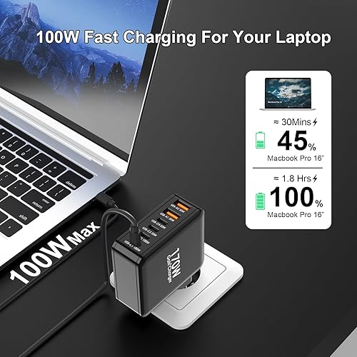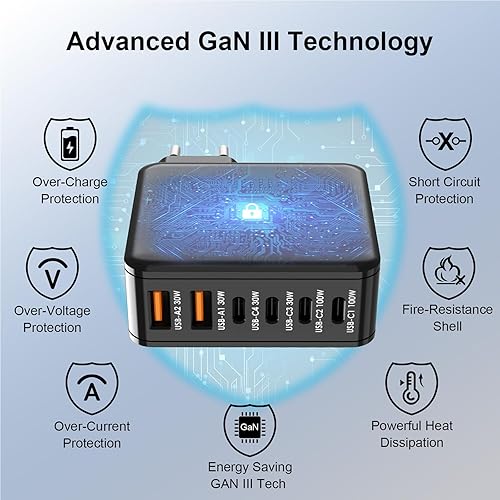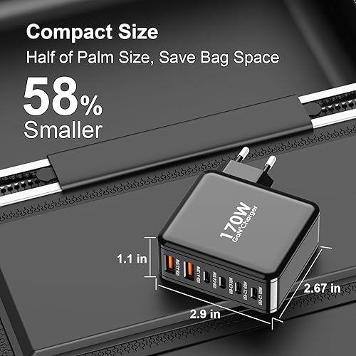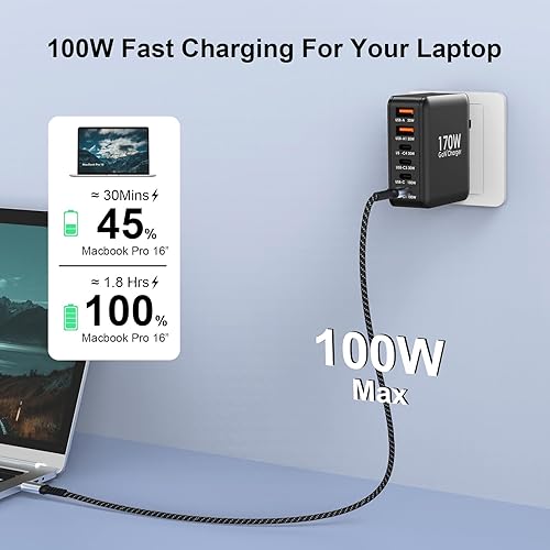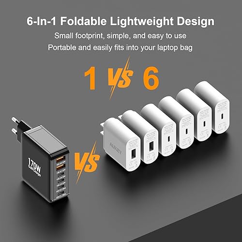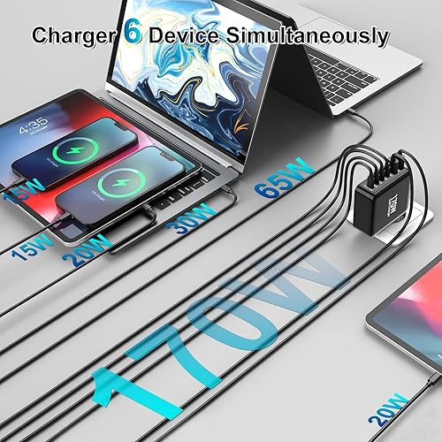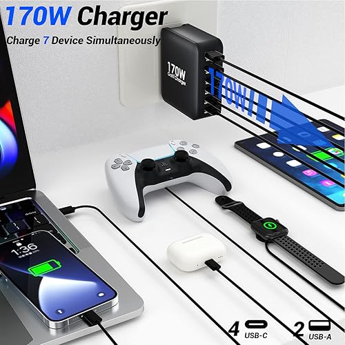 Ubigbuy Caricabatterie USB C da 170 W con 6 porte (4 x USB-C 100 W/30 W + 2 x USB-A 30 W) – Caricatore rapido compatto PD 3.0, PPS, QC3.0 per MacBook Pro, iPad, iPhone 16/15, Galaxy S24/S23