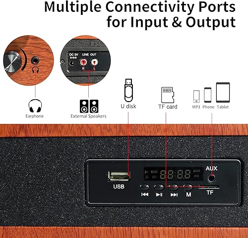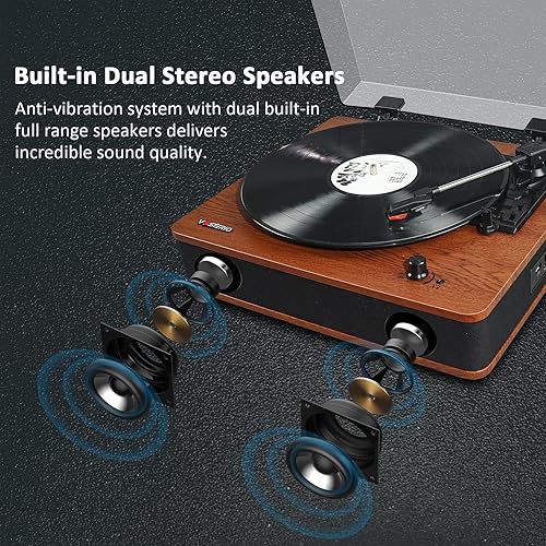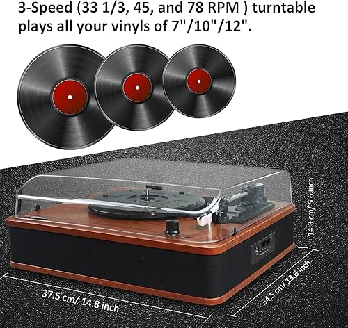 Vinile Giradischi Bluetooth con Casse, Lettore LP Vintage con Altoparlanti Stereo, 3 Velocità Gira Dischi per Vinili con Uscite RCA, Presa Cuffie, Radio FM, USB, Aux-in e display a LED