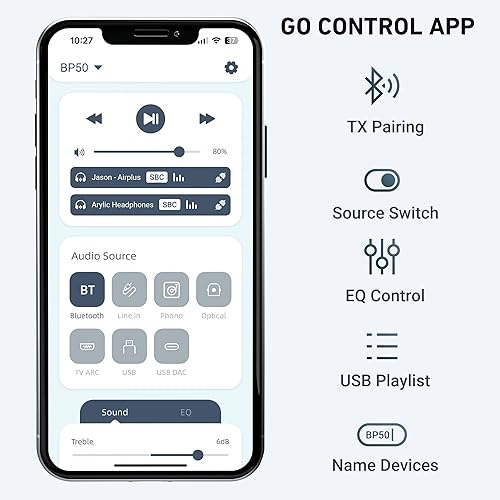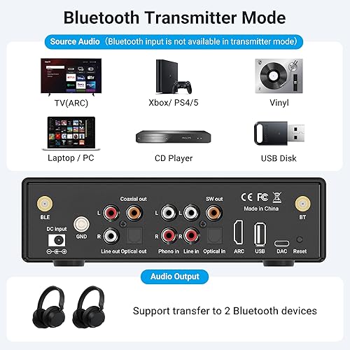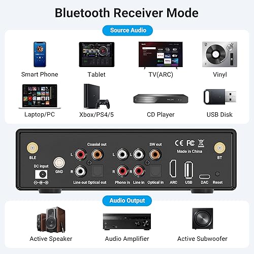 BP50 Sintoamplificatore musicale Home Stereo Bluetooth 5.2 aptX con HDMI ARC, ingresso Phono e GO Control APP Adattatore audio con DAC, uscite RCA per ricevitore AV o preamplificatore stereo