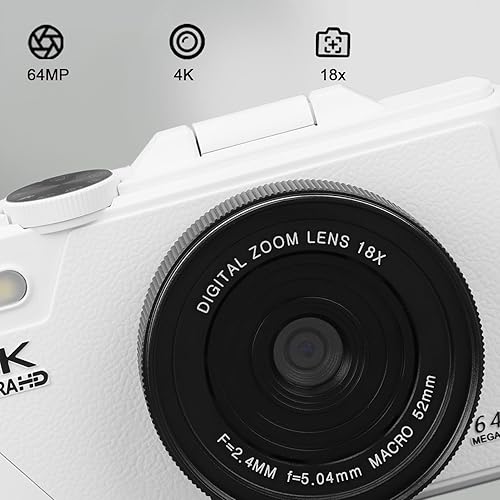 Fotocamera Digitale UHD 4K da 64 MP per Fotografia, Fotocamere Compatte con Zoom Automatico 18x e Schermo Ribaltabile da 3 Pollici, Fotocamera per Ricaricabile da 1150