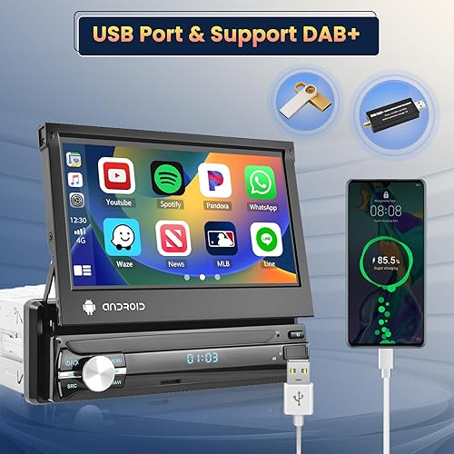 Autoradio 1 Din Android con Schermo Retrattile da 7 Pollici Wireless Carplay Android Auto, 1G+32G, Touchscreen Stereo Auto Bluetooth con GPS WiFi RDS/FM SWC Telecamera Posteriore Mic