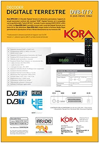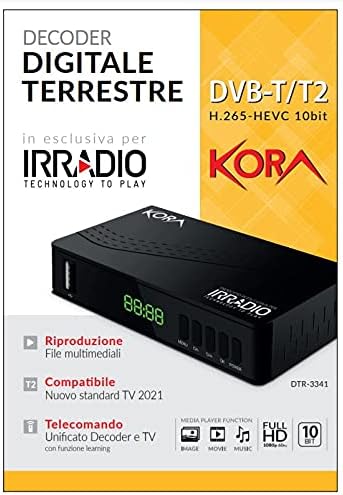 Decoder Digitale Terrestre IRRADIO KORA DTR-3341 che supporta lo standard DVB-T2 HEVC H.265, Funzione Media Player, Audio/Video/Foto, 1080p – Compatibile con TV Smart