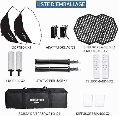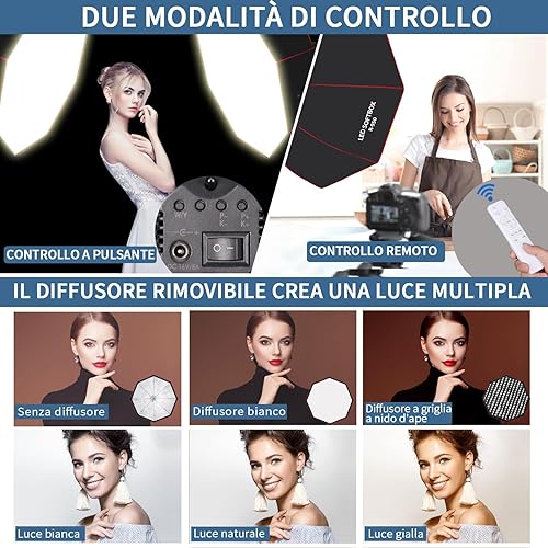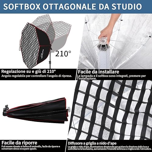110W Softbox Ottagonale Parabolico Kit di Luce, 37,4 pollici/95cm con Griglia a Nido d'Ape/Telecomando/Supporto per Luce da Studio, Registrazione Video, Ritratti, Fotografia di Prodotto, Live