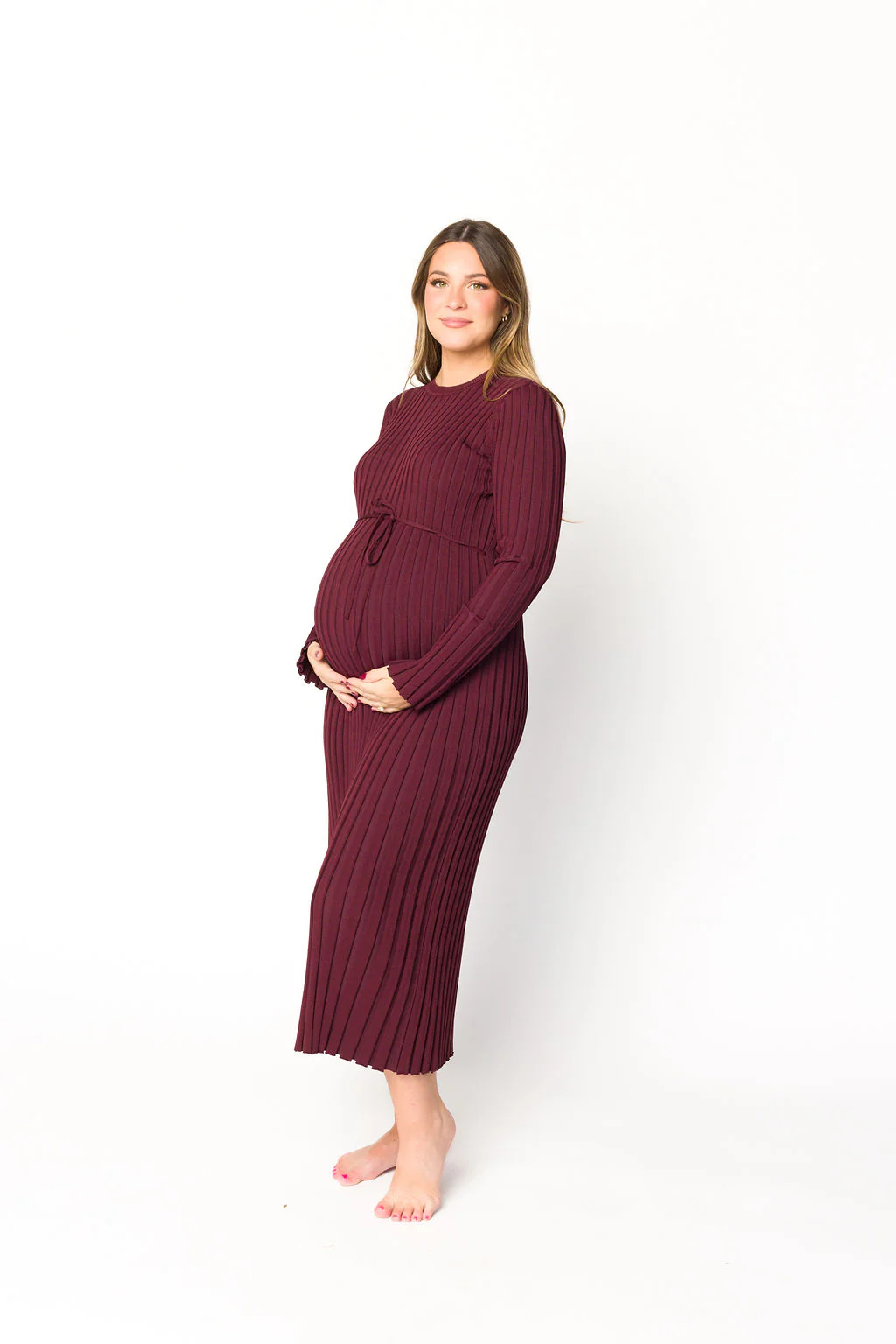 Colette Premium Long Sleeved Ribbed Knit Maxi Dress in Burgundy - Bump Friendly