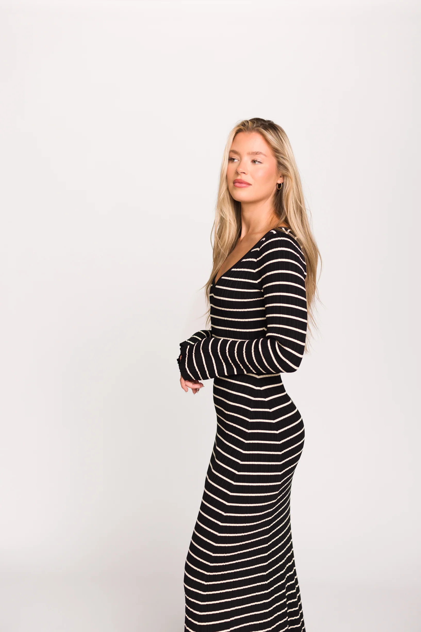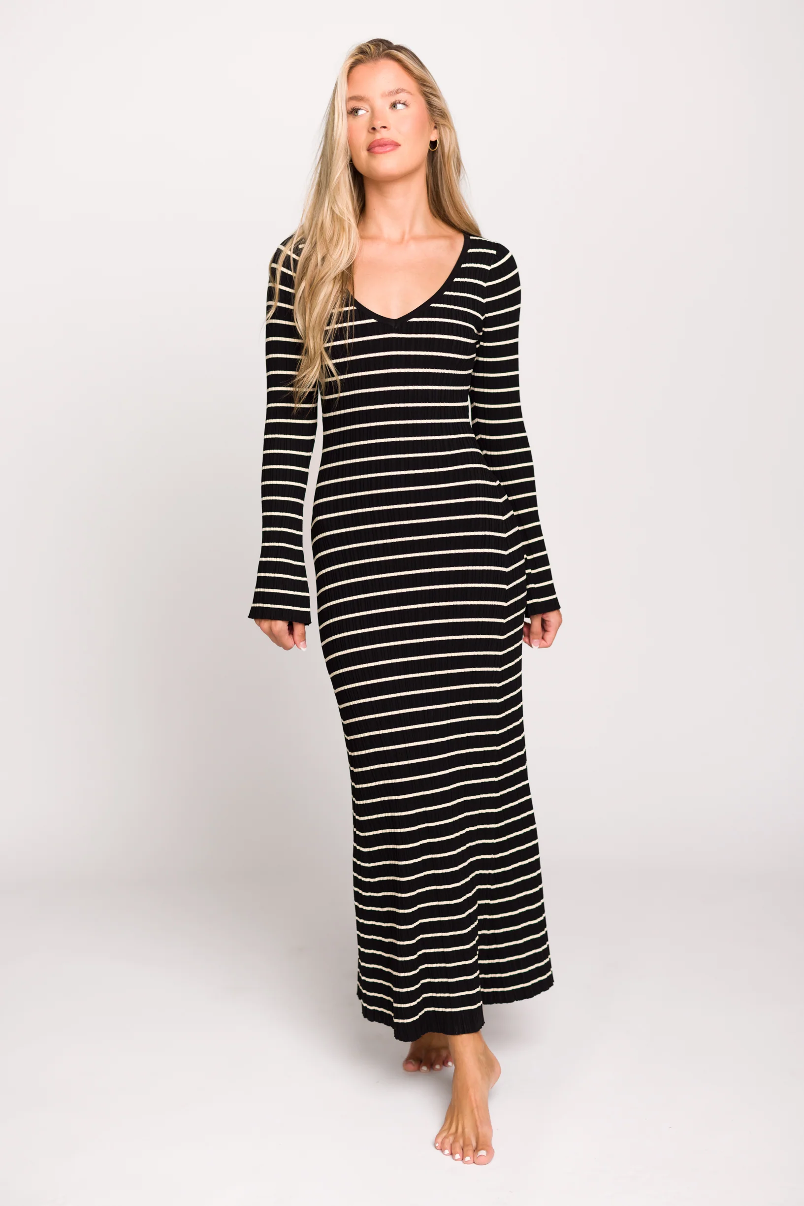 Keaton Knit Maxi Dress with V-Neckline in Black/Cream Stripe