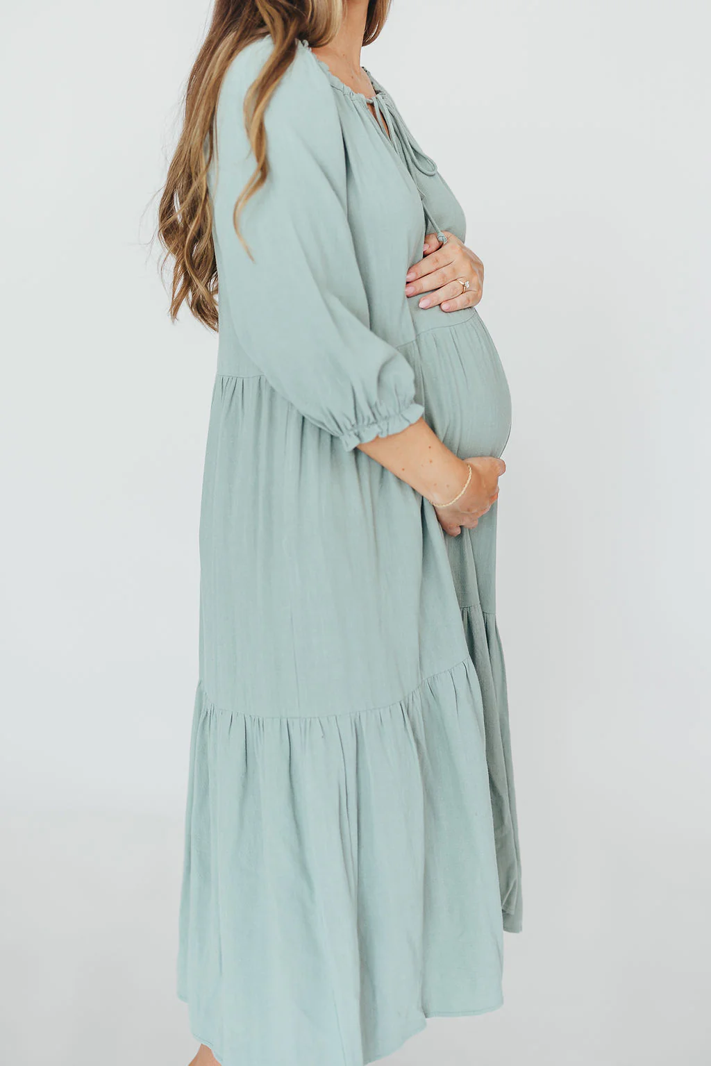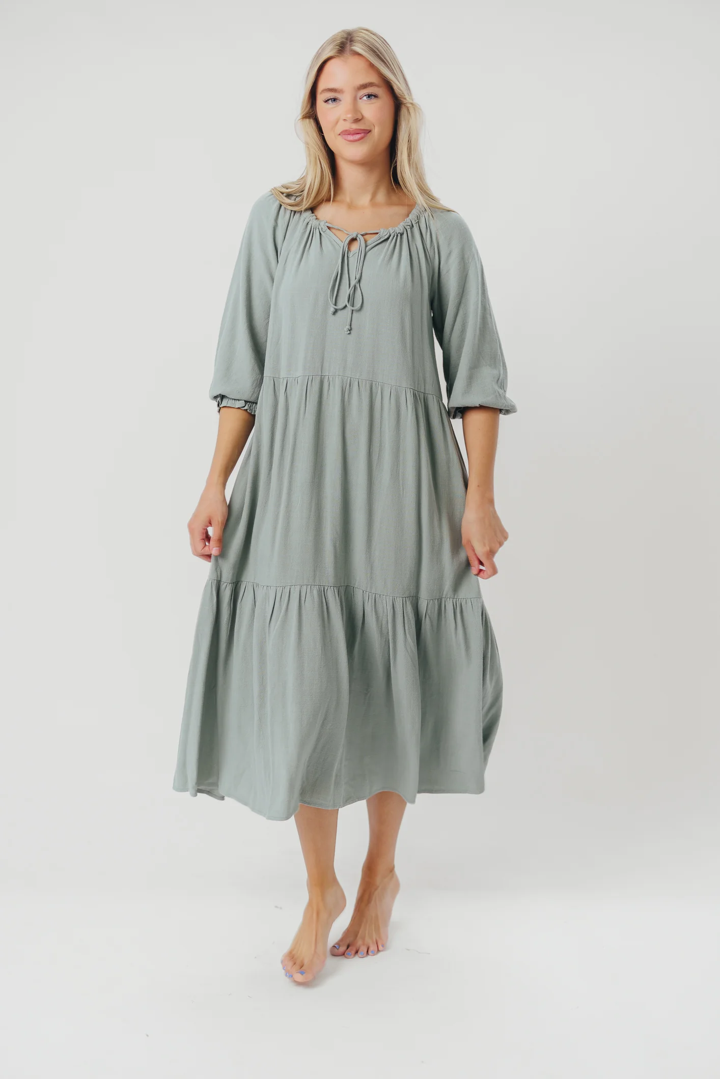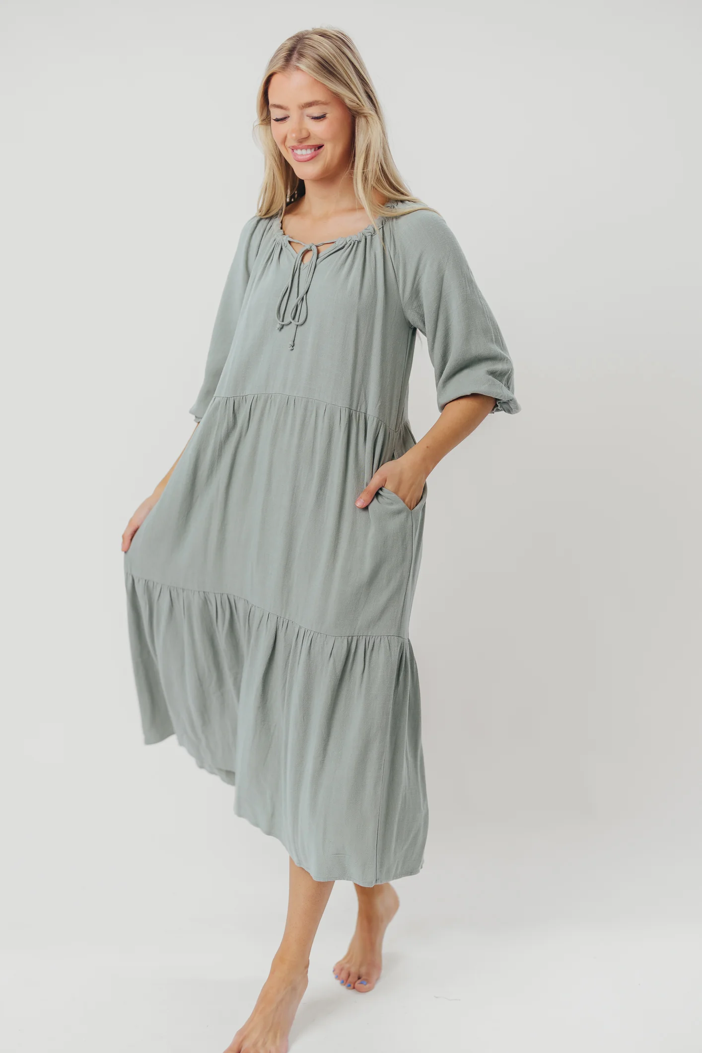Avery Tiered Linen-Blend Midi Dress in Sage - Bump Friendly and Inclusive Sizing