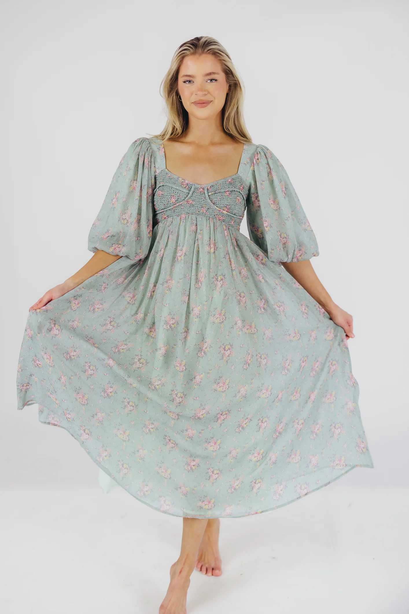 Lila Floral Printed Smocked Midi Dress in Pink - Bump Friendly