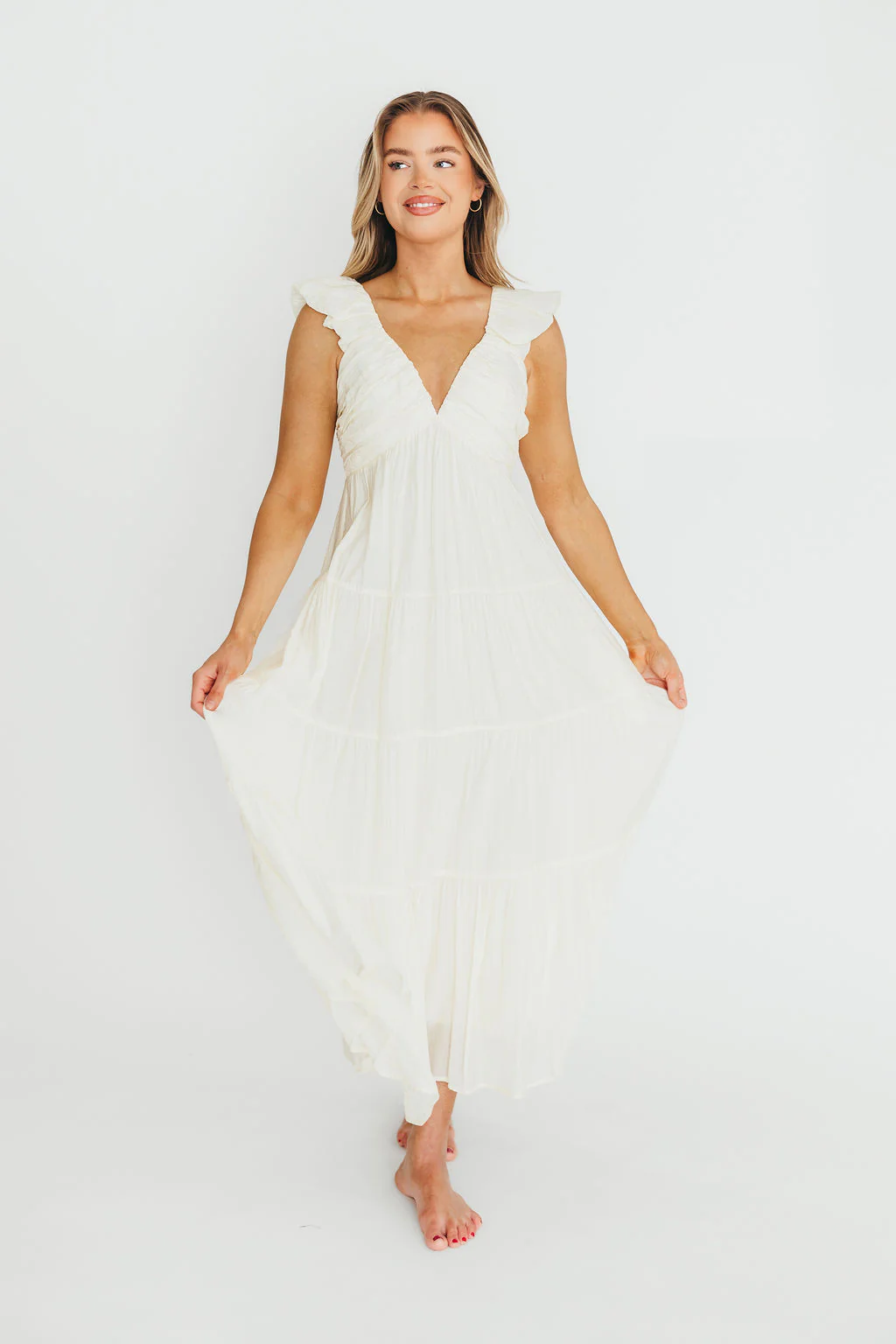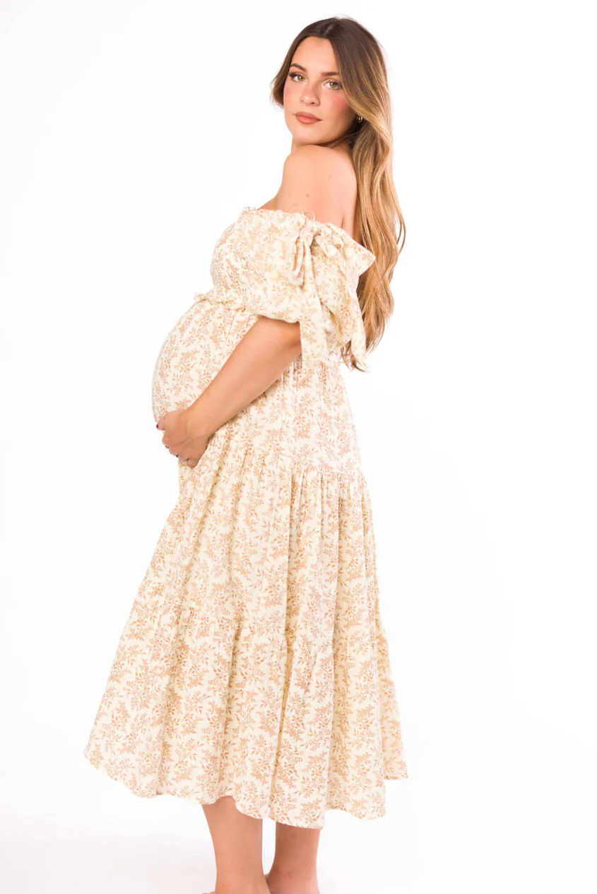 Katy Pleated Bodice Midi Dress in Cream - Bump Friendly (Restocking Mid May)