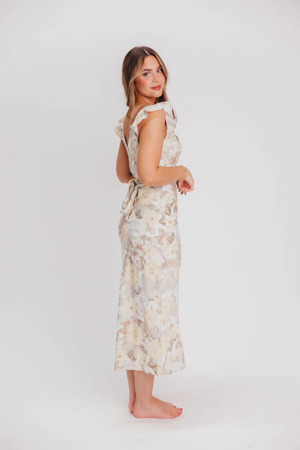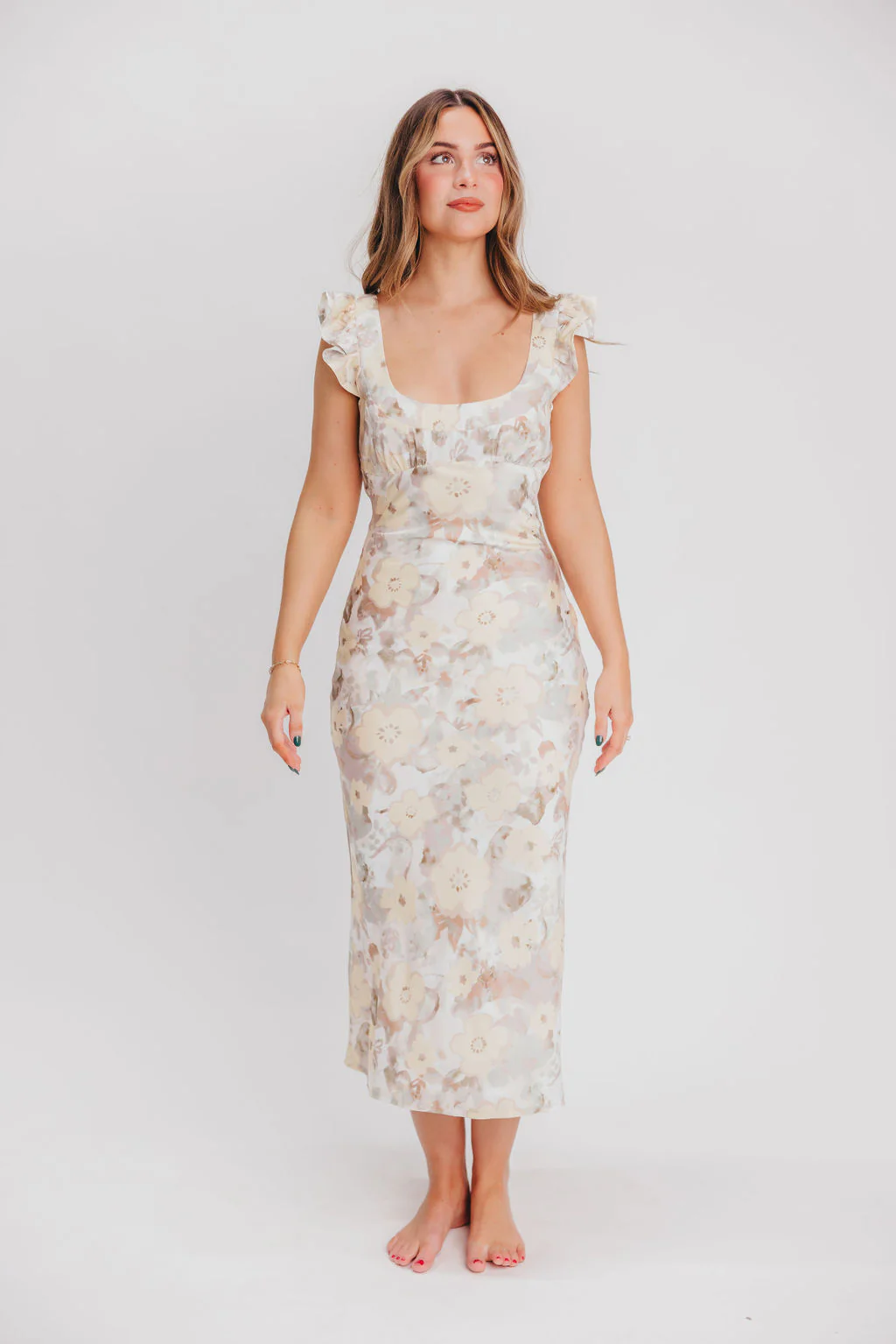 Pisa Floral Chiffon Midi Dress with Ruffle Shoulder in Champagne
